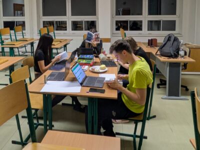 26. 11. ve večerních hodinách v pěti různých učebnách soutěžilo pět týmů v mezinárodní soutěži Fyziklání Online. Všechny naše týmy se umístily velmi dobře. Tým maturantů „Nefyzikáři“ (Korbelová, Krásný, Tosiová, Reissmüllerová) získal 92 bodů a byl tak ve své kategorii na 170. místě (11. z českých týmů). V kategorii C jsme jsme měli celkem 4 týmy. Nejlépe z nich dopadl tým „Zbylo …